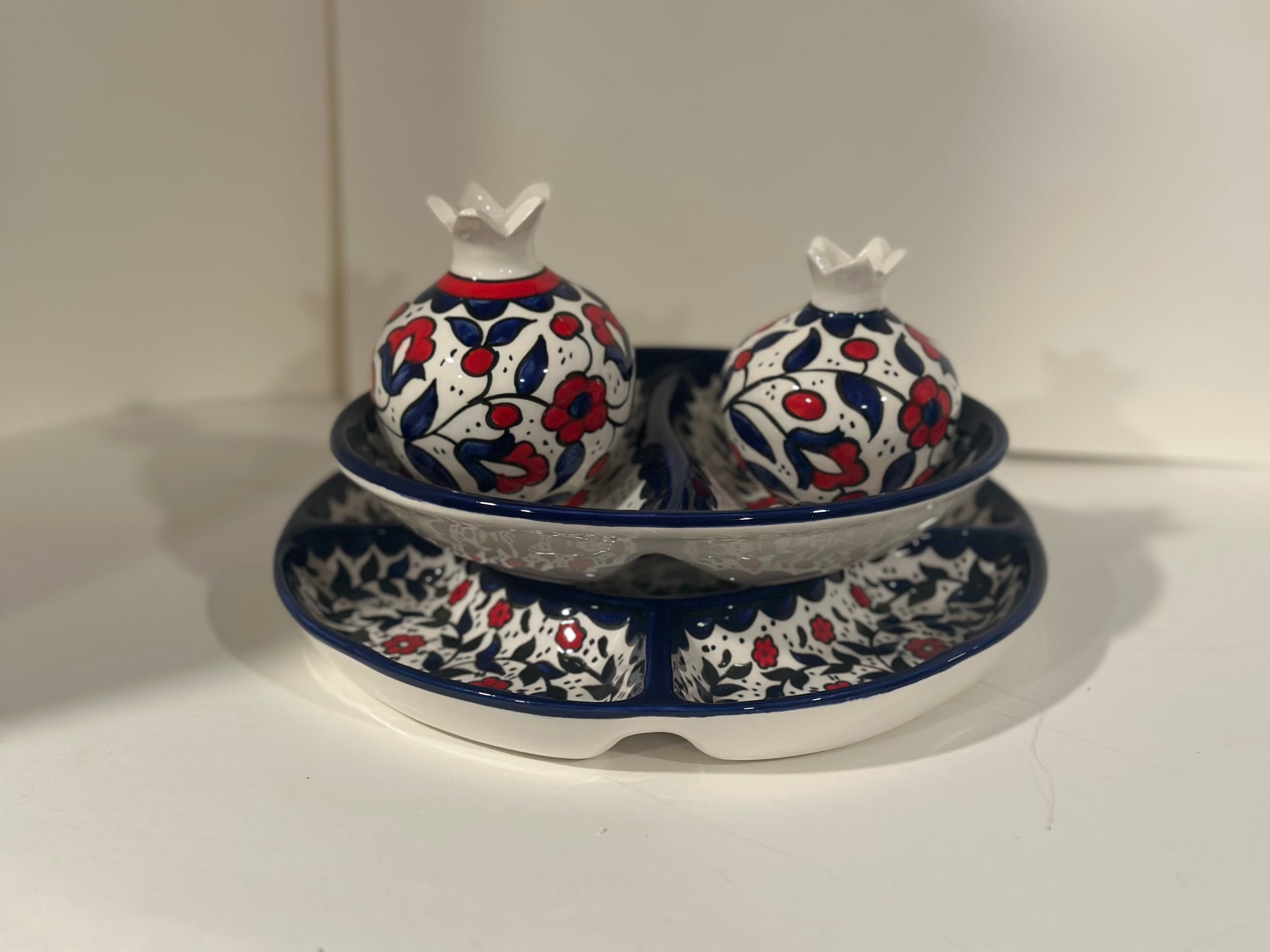 Made in Palestine and hand painted by skilled artisans, this four-piece set includes a large divided mezza platter, a coordinating medium serving dish, and two decorative ceramic pomegranates.