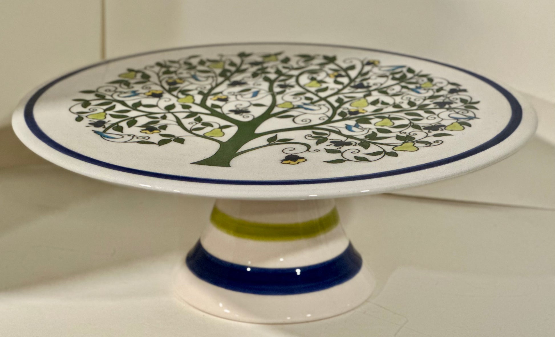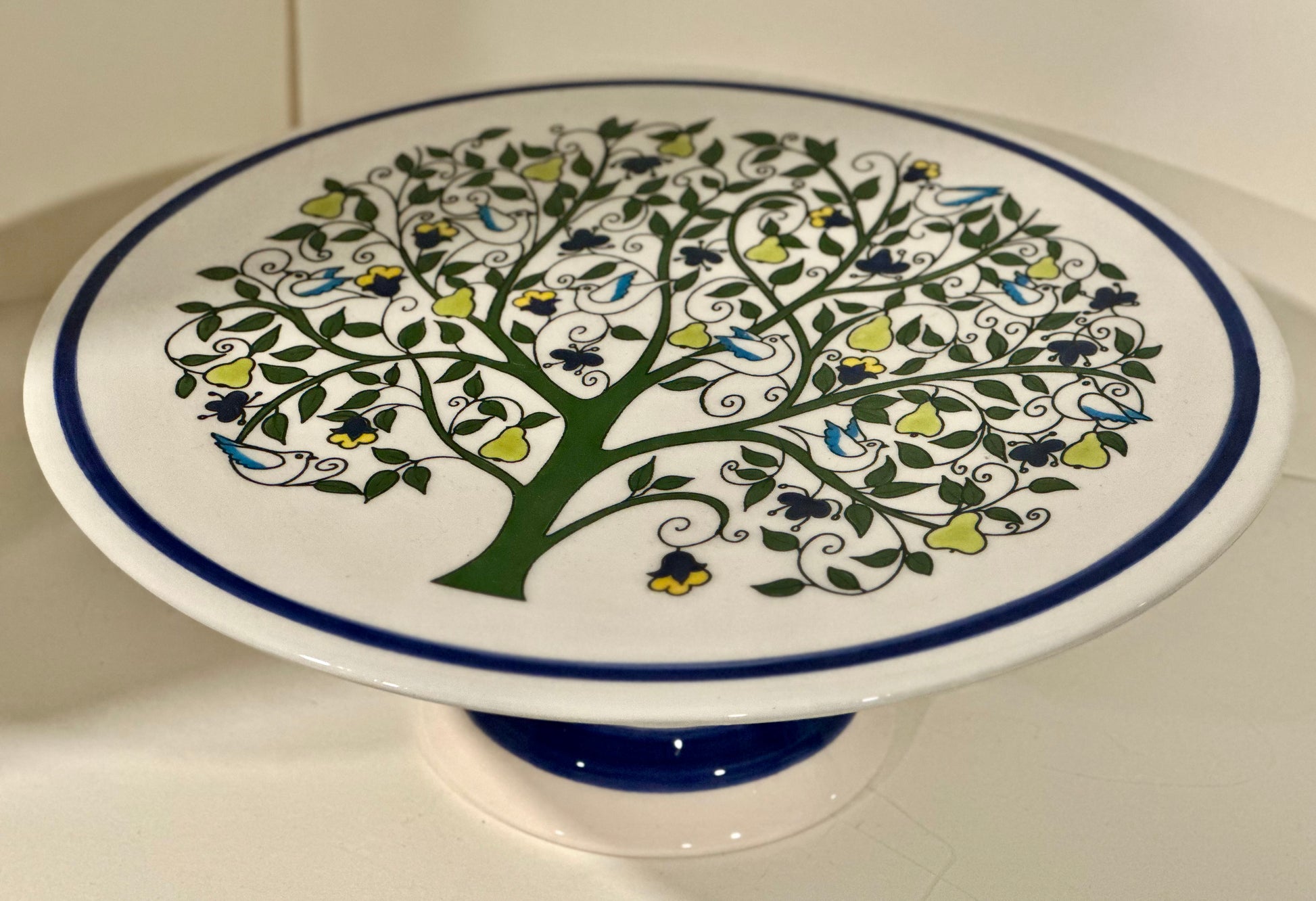 Made in Palestine and hand painted by skilled artisans, this elevated cake platter features a beautifully detailed tree design symbolizing life, growth, and heritage. Soft greens and blues are set against a clean white base, finished with a rich blue rim.
