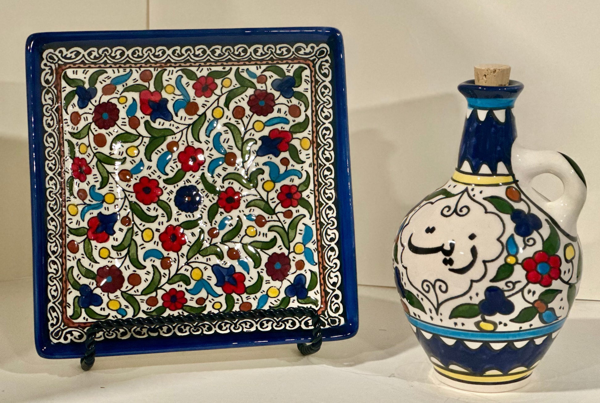 Made in Palestine and hand painted by skilled artisans, this olive oil bottle and matching plate set brings heritage to the table. The vibrant floral design and rich blue detailing reflect generations of traditional ceramic artistry.