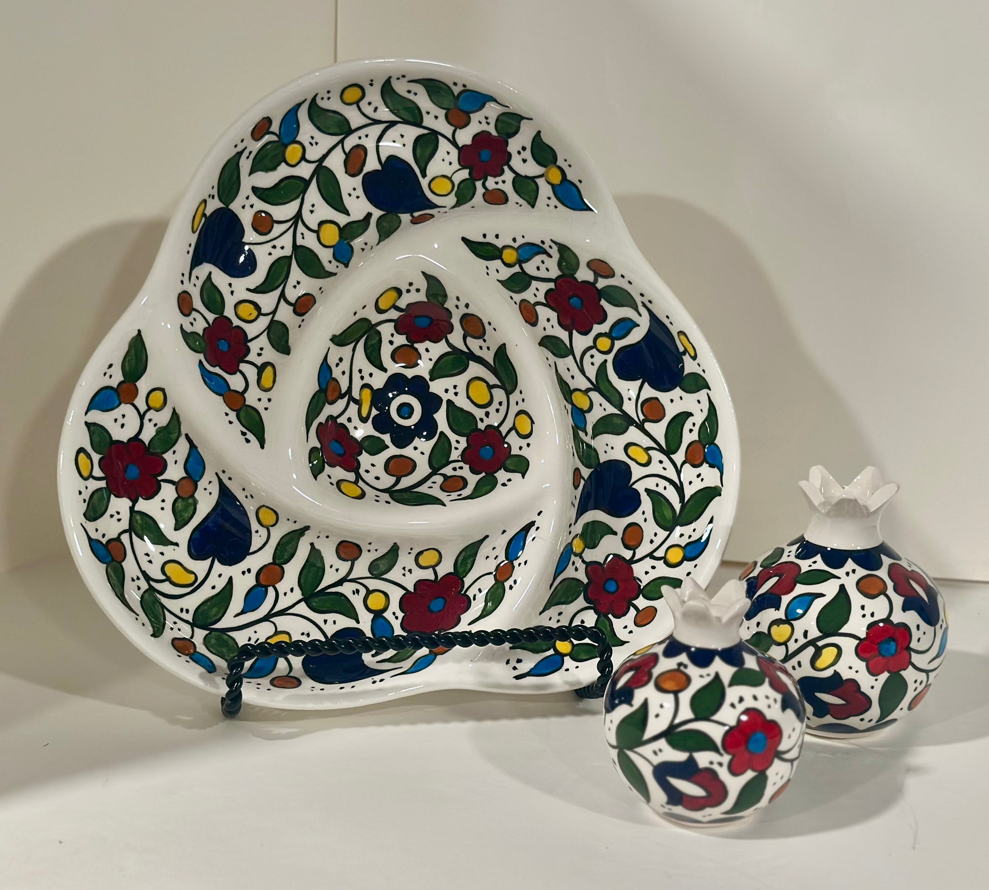 Made in Palestine and hand painted by skilled artisans, this statement set includes a large divided serving platter and two decorative ceramic pomegranates. The vibrant floral motifs and rich, layered design reflect generations of Palestinian ceramic tradition.