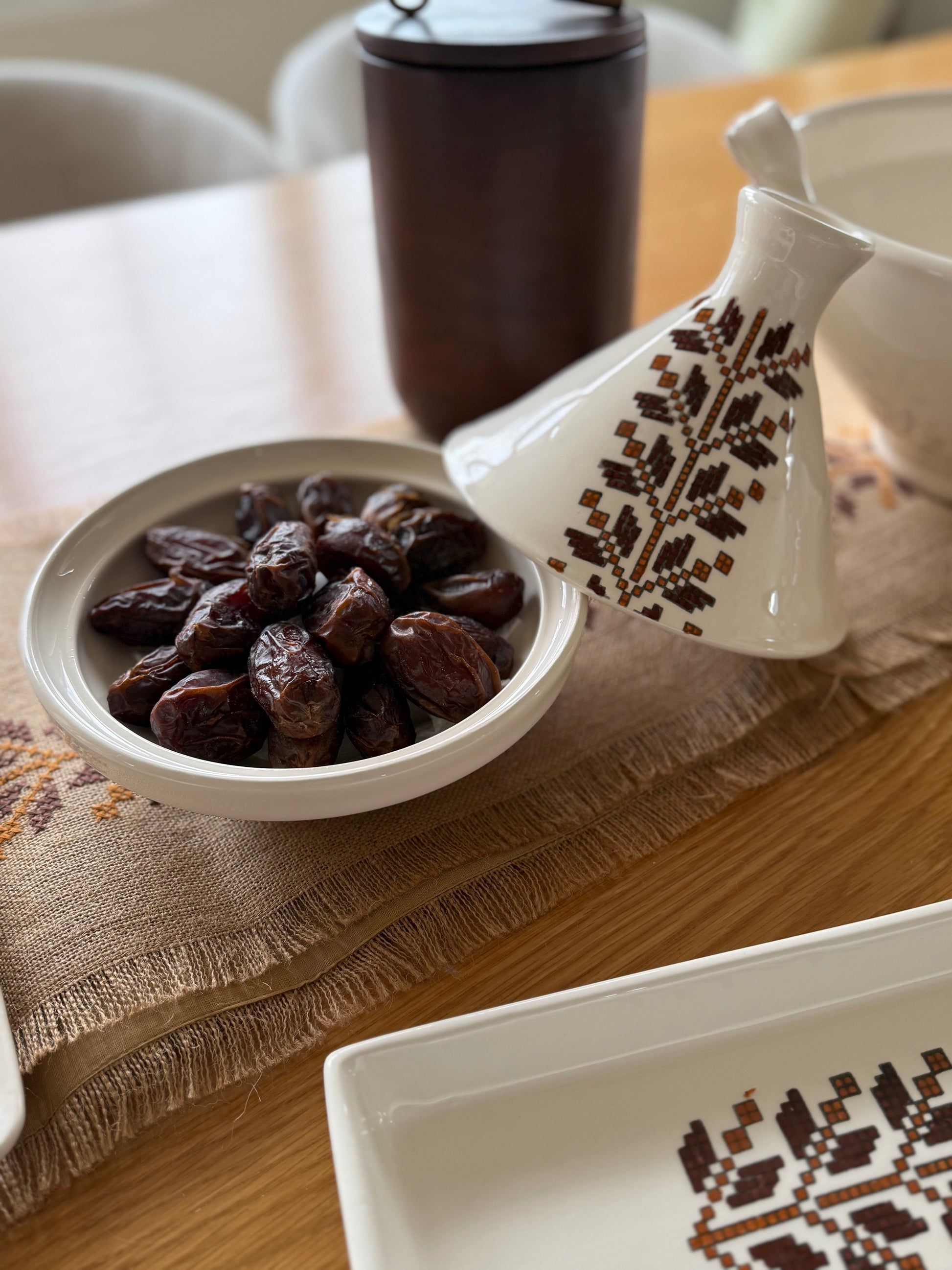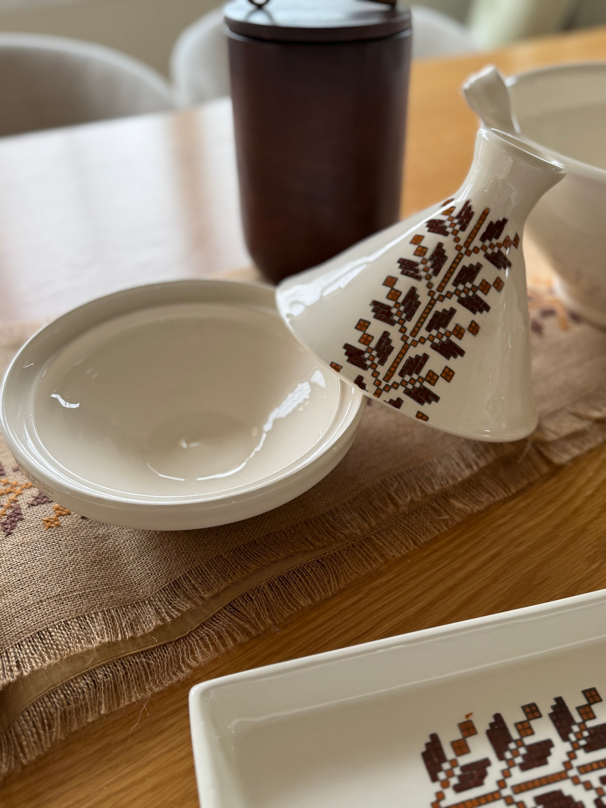 This ceramic tangine is hand-painted with a traditional Palestinian tatreez motif in rich earth tones over a soft ivory base. The sculptural lid and curved silhouette make it both functional and decorative—perfect for serving warm dips, dates, nuts, sauces, or small dishes during gatherings.