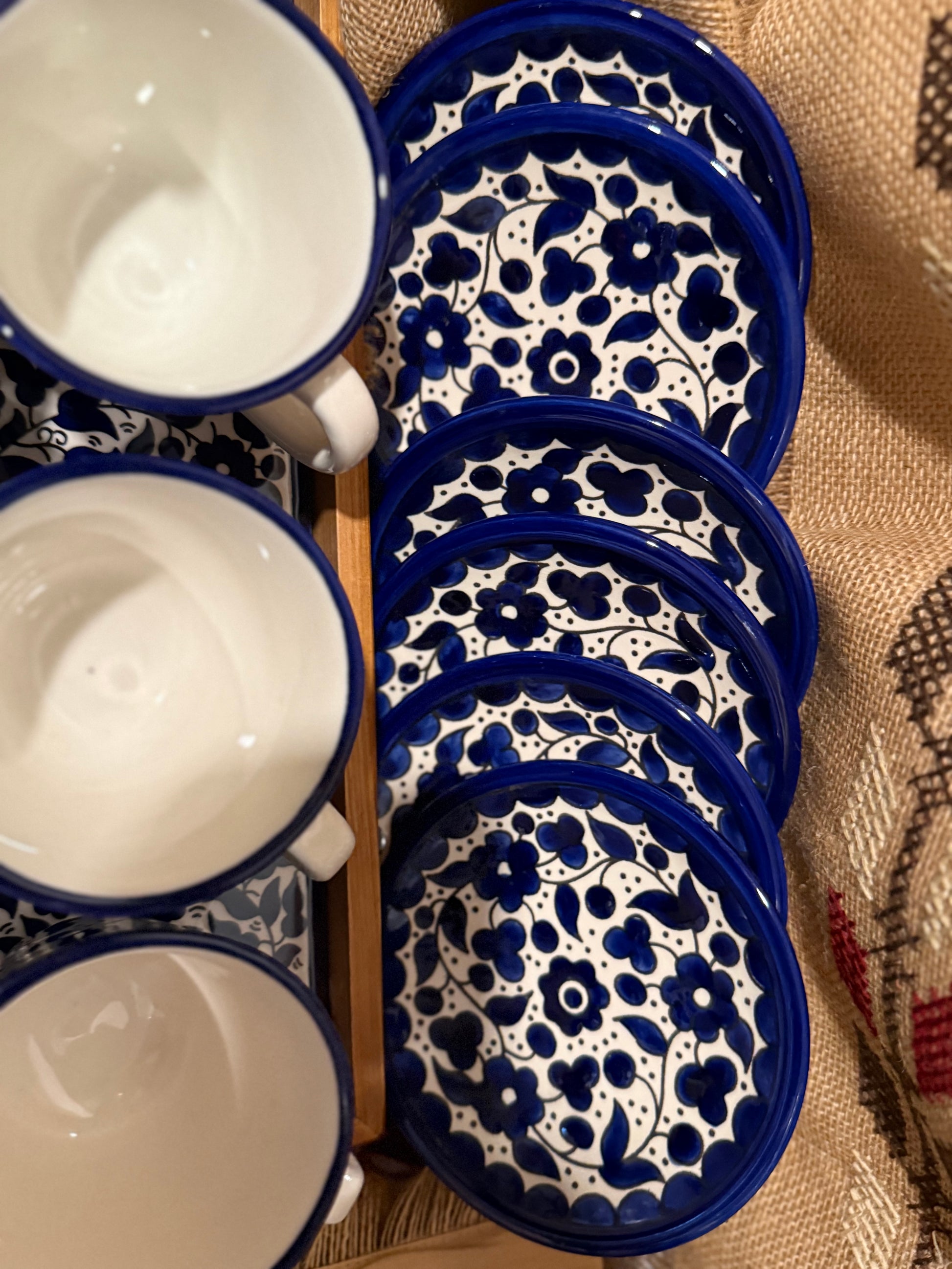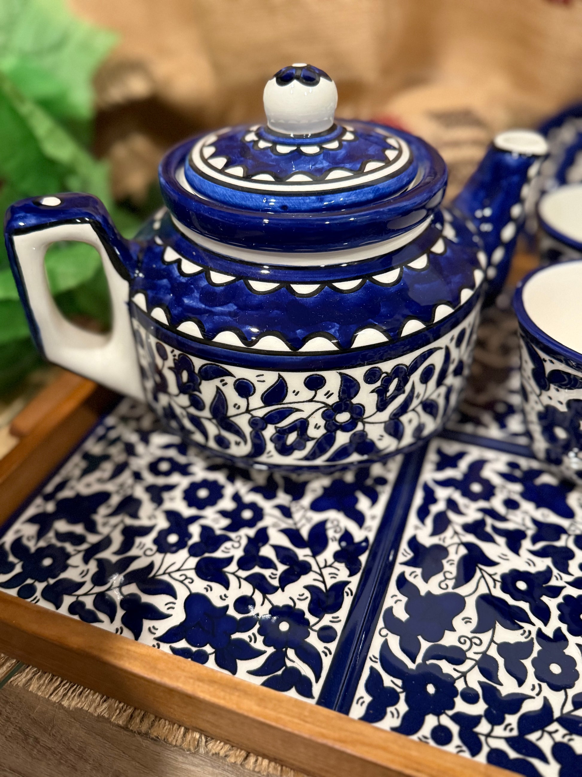 A timeless set made for slow afternoons and full tables. Handcrafted and hand-painted in Hebron, Palestine, this deep cobalt blue tea set carries traditional floral motifs that feel both classic and bold.