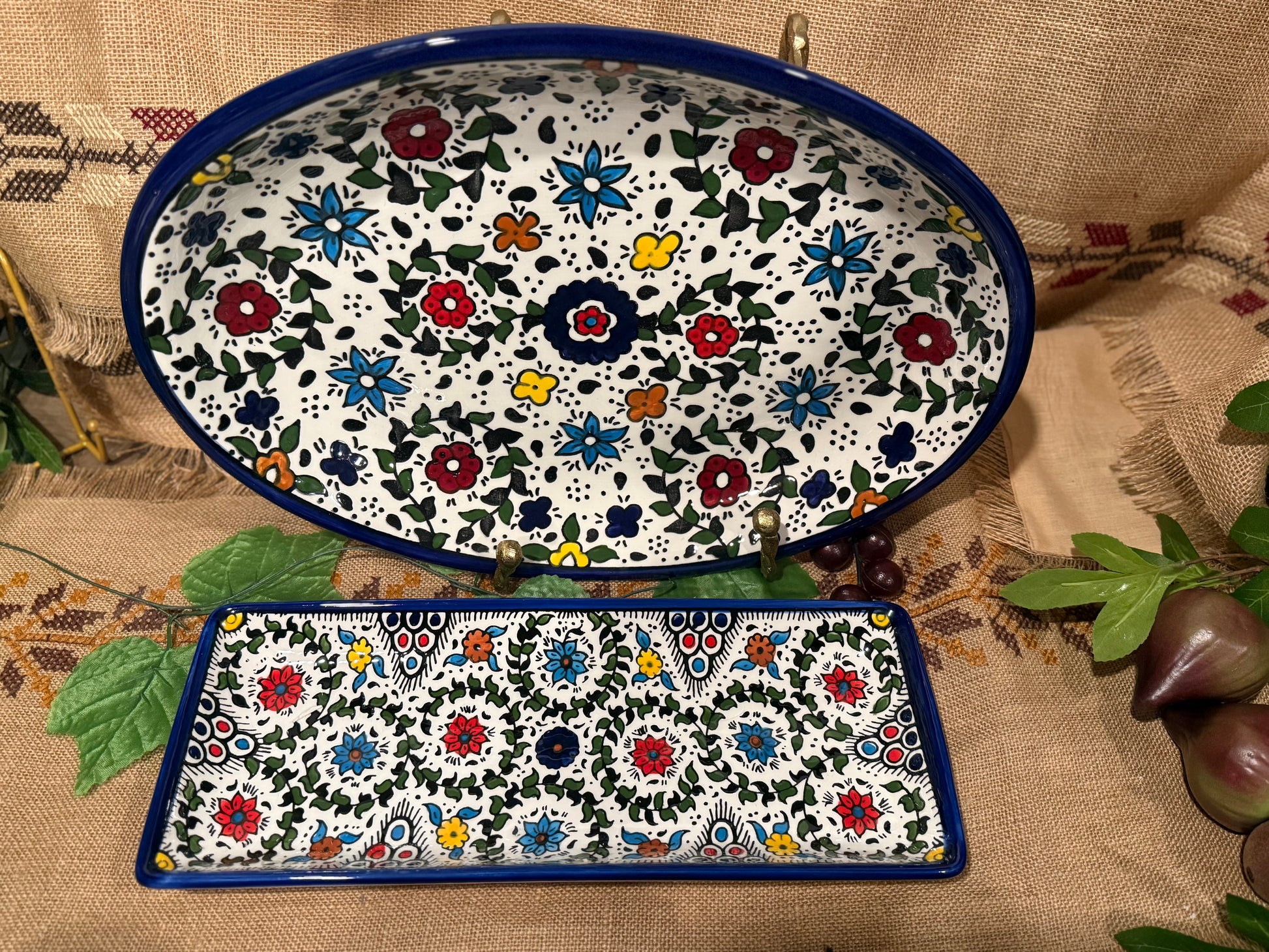 Hand-painted in Hebron, Palestine, this serving set is full of color and detail. The oval platter is perfect for mains or shared dishes, and the rectangular plate works beautifully for appetizers or sweets.