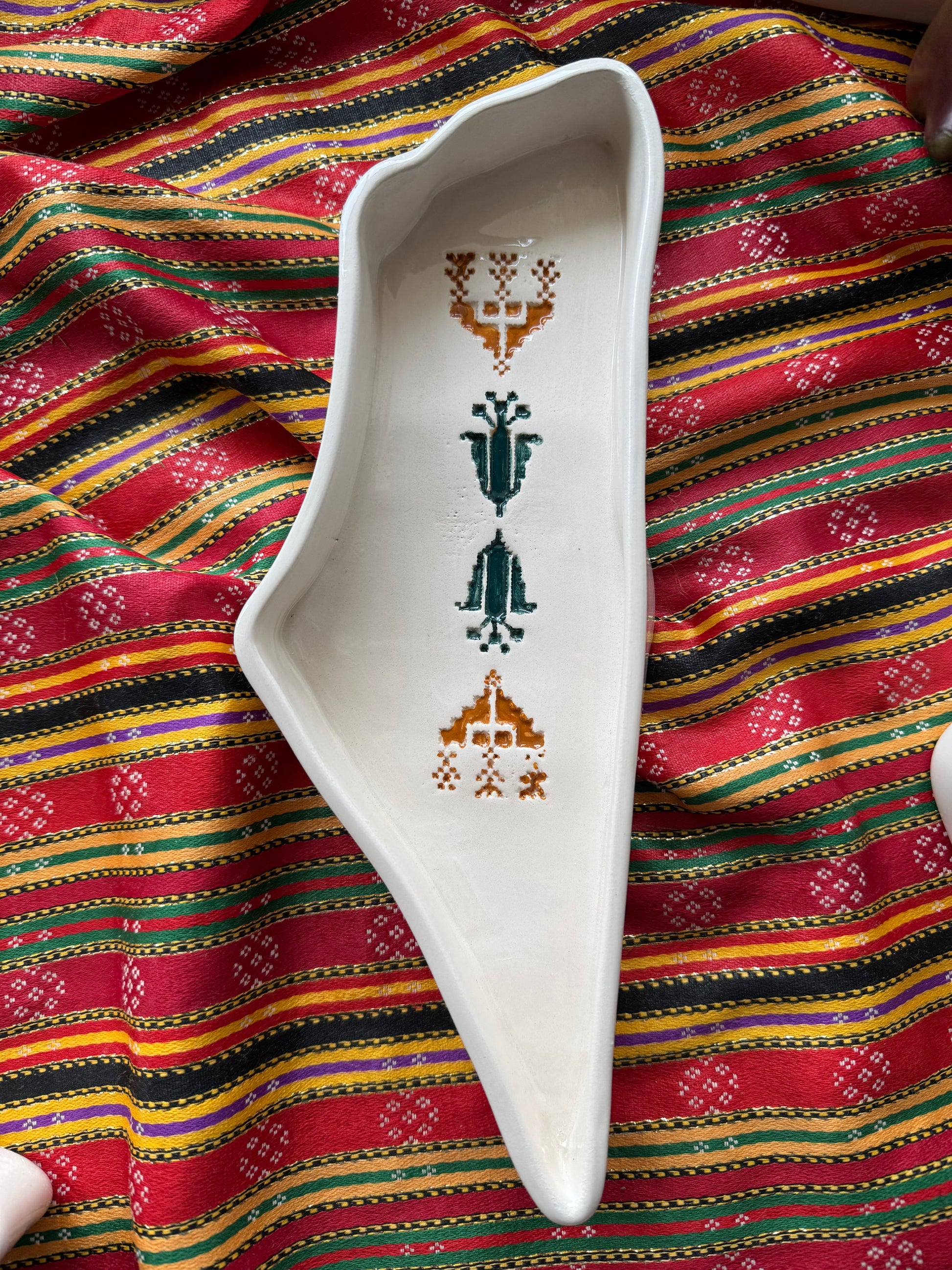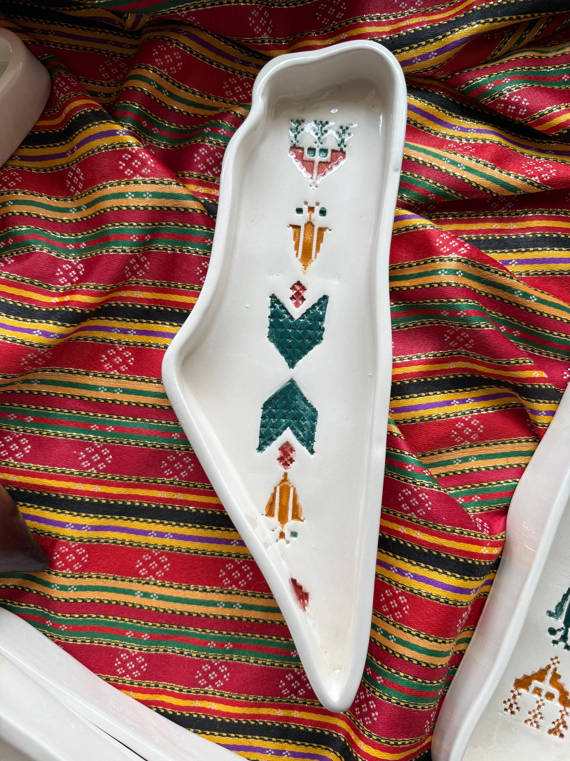 Every curve, every brushstroke tells a story. This ceramic dish, hand-shaped in the silhouette of Palestine, carries the heritage of Tatreez — traditional Palestinian embroidery — reimagined in clay. Each motif is carefully hand-painted, reflecting patterns passed down through generations and symbolizing resilience, identity, and beauty in imperfection.