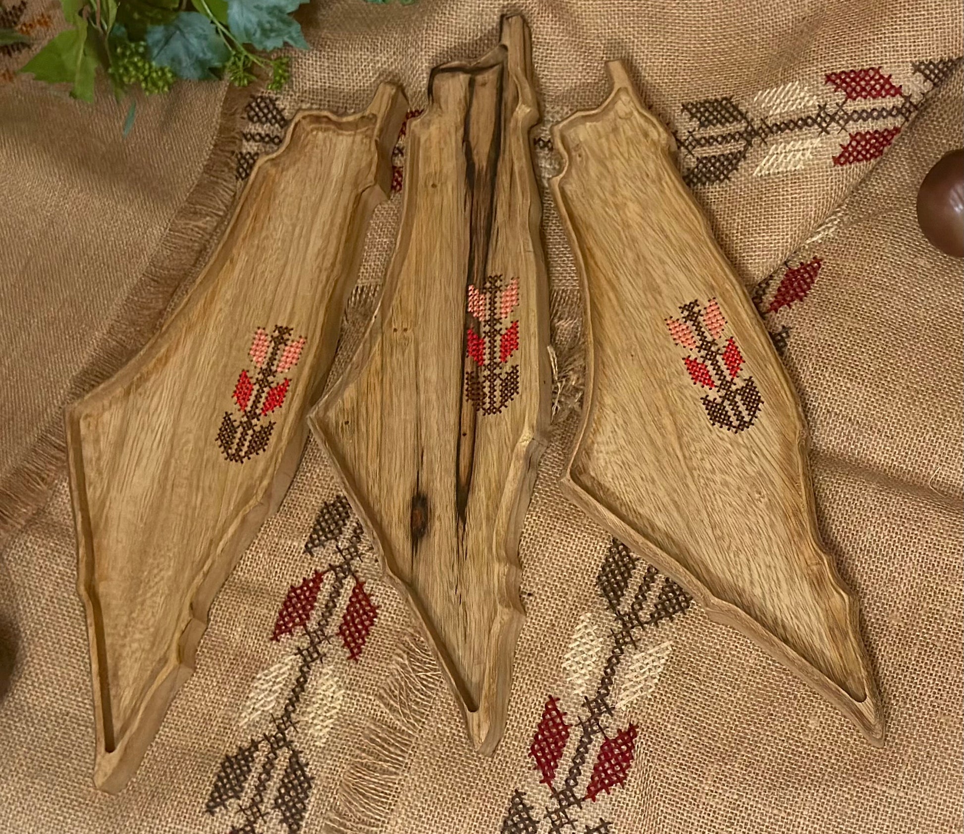 Hand-embroidered tatreez on wood, carved in the shape of Palestine.