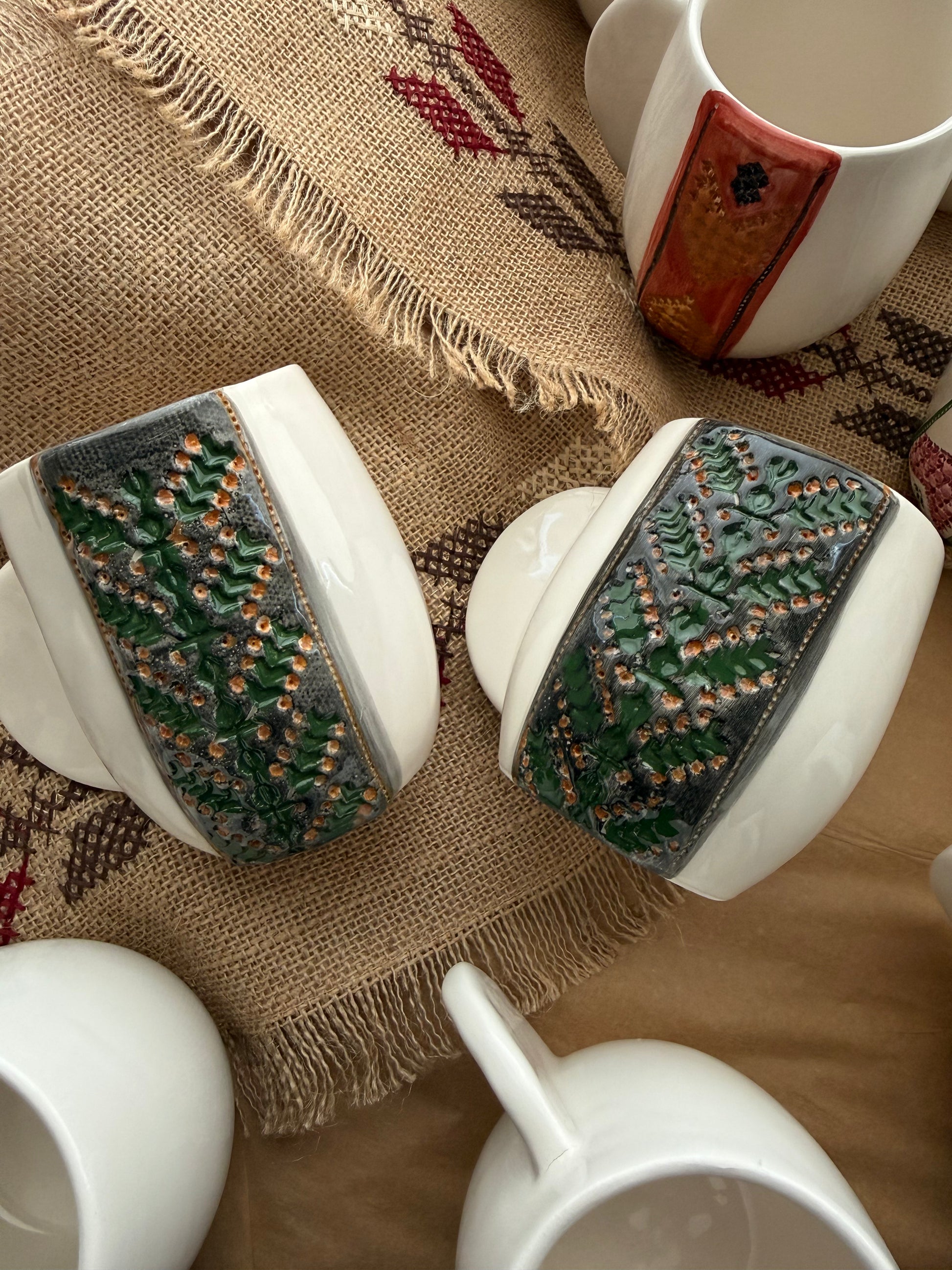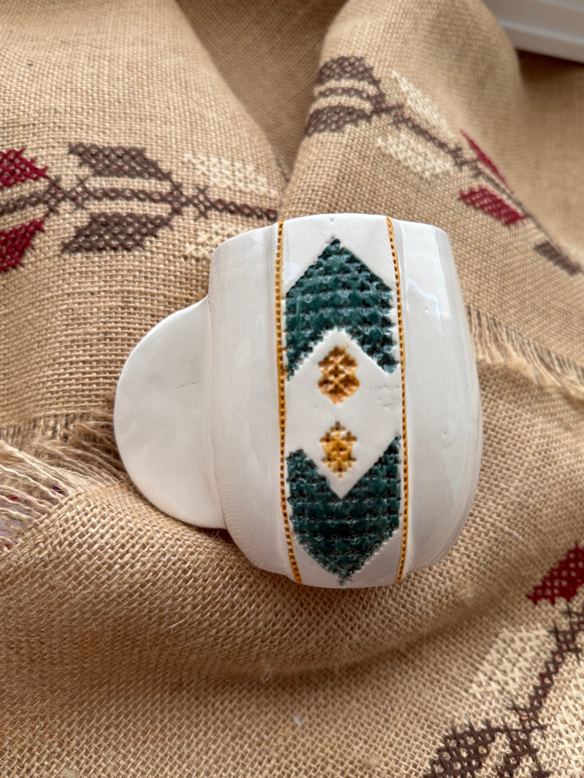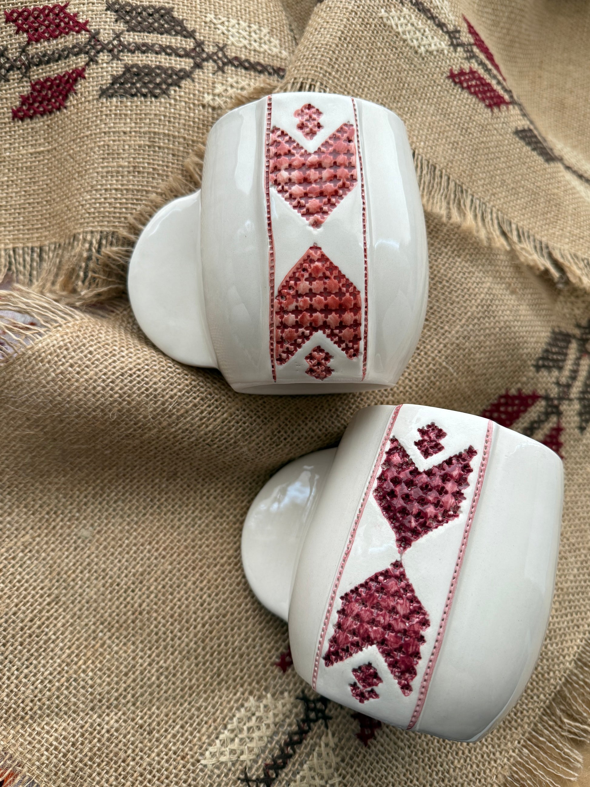 Our Tatreez Coffee Mugs pair Meem & Coco’s clean, sculptural design with hand-painted embroidery motifs passed down through generations.